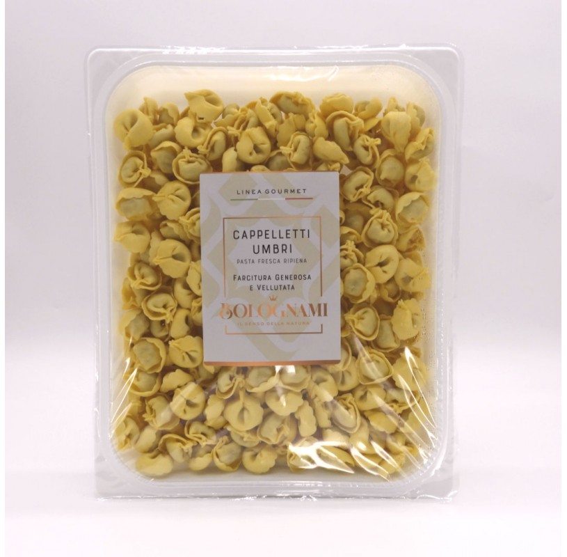 Capelletti Umbri Freschi Artigianali Bolognami, fatti a mano secondo tradizione, questa Pasta Ripiena di Carne e nella storia millenaria dell'Umbria, le prime notizzie addirittura si fanno risalire all'epoca degli antichi Romani, ma è nel Rinascimento che viene menzionata più specificatamente comparendo spesso nelle mense signorili e nei conventi. Preparata con ingreienti tradizionali della nostra regione Umbria rappresnta una delle eccelleze gastronomiche della stessa.